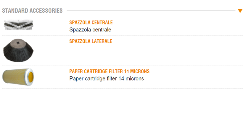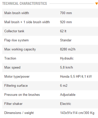 Ideal for large surfaces. Large filter surface distributed on 6 cartridge filters fitted with electric filter shaker. Side brush raising control. Complete left side brush. Suction switch off. Lift flap pedal. Flashing light. Main brush pressure regulation. Indirect back collection. Front dust vacuum system. Quick changing of the main brush and side brush without tools. Long life elastic belts. Suction selection lever. Shock proof steel frame. Traction lever. Antistatic device. Wide collector tank. Heavy duty steel frame. Adjustable seat. Perfectly balanced weight of the components, thus resulting in totally safe quick changes of direction. Front light system (optional on request). Complete left side brush