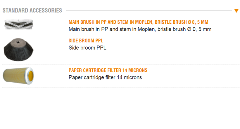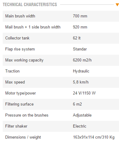 Ideal for large surfaces. Large filter surface distributed on 6 cartridge filters fitted with electric filter shaker. Side brush raising control. Unload device for tank emptying into dust containers up to 110 cm height. Complete left side brush. Suction switch off. Lift flap pedal. Flashing light. Main brush pressure regulation. Indirect back collection. Front dust vacuum system. Quick changing of the main brush and side brush without tools. Long life elastic belts. Suction selection lever. Shock proof steel frame. Traction lever. Antistatic device. Battery level indicator. Wide collector tank. Heavy duty steel frame. Adjustable seat. Perfectly balanced weight of the components, thus resulting in totally safe quick changes of direction. Battery and battery charger not included. Front light system (optional on request). Complete left side brush
