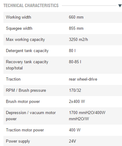 - Double counter rotating brush (66 cm of scrubbing width) obtaining better stability and constant pressure.