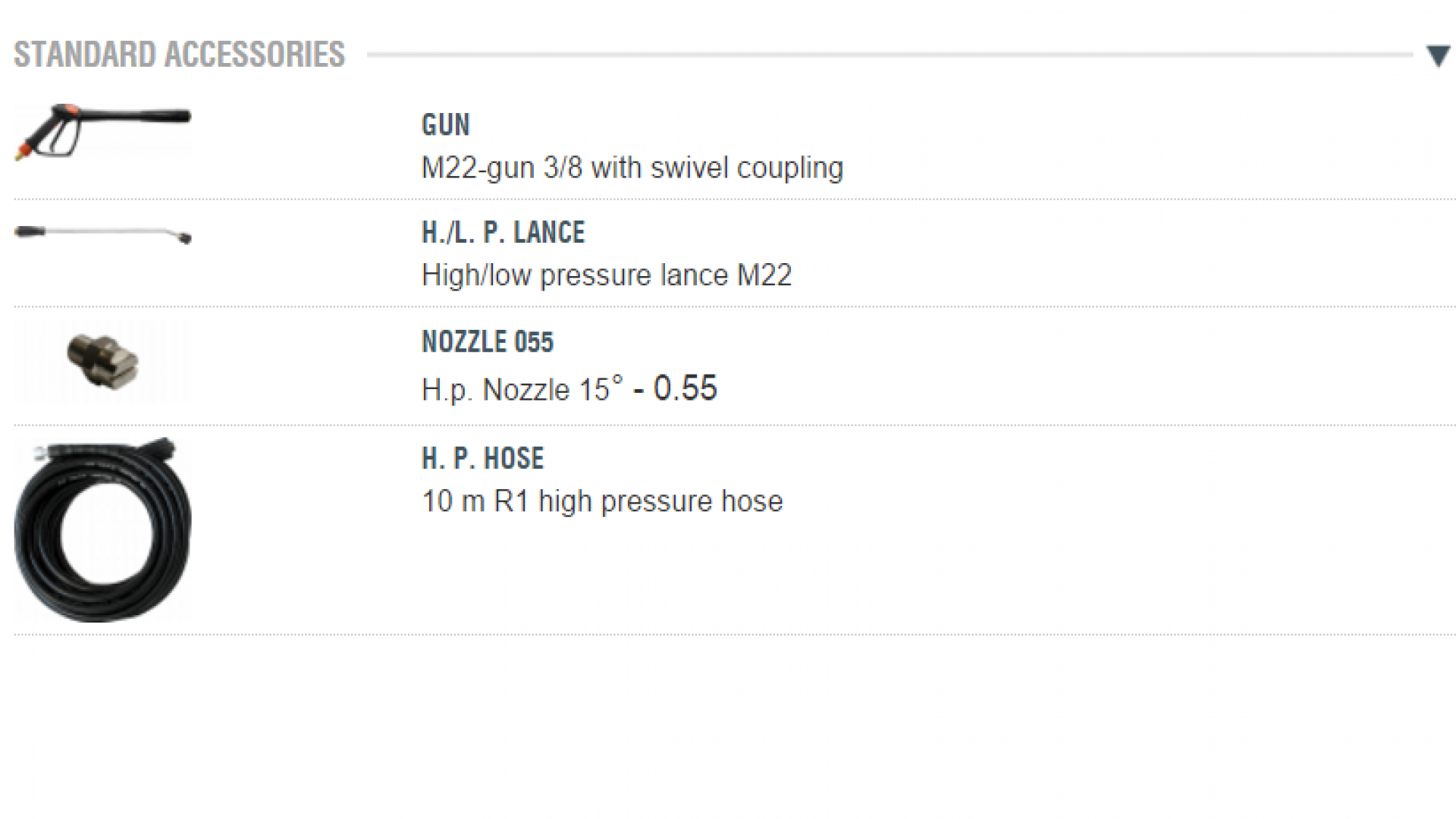 Three ceramic pistons, brass linear pump head with built-in by-pass valve. 1500 RPM reducer between engine and pump. By-pass with safety valve. Electrical start with engine control functions. Lombardini 15LD400 diesel engine (air cooled). Integrated detergent suction with external suction probe. Pressure regulator. Pressure gauge Glicerine. Suction hose with check valve (optional). Heavy duty steel frame. Battery included.