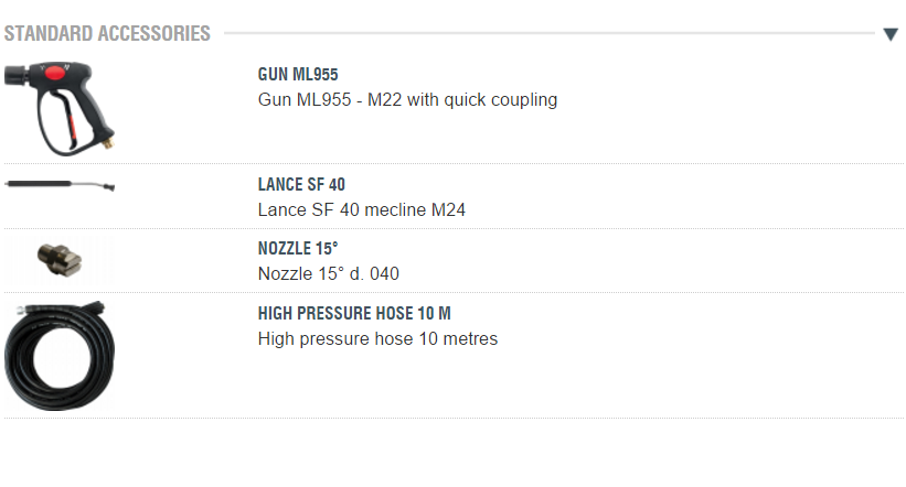 • Motor 12-15 hp • Heavy duty structure with stainless steel covers • High filtering capacity catridge suction brass filte • TW Triplex Premium pumps • Pressure gauge with stainless steel casing • Hot water seals 4-poles (1400 rpm) motor well oversized and protected with paint. Ø 300 wheels with brake • Highly professional unloader valve with external bypass • Motor-pump with flexible join • Timed Total Stop • Low voltage control panel • Contactor • Thermal relay motor protection • The stainless steel hose reel can be mounted on request (cod. 0.966.0033 mod. 2521/cod. 0.966.0034 mod. 3518) • Practical and safe housing accessories