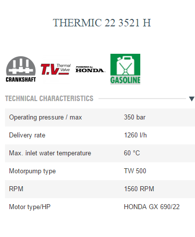 Comet TW Premium, TW 500 bar Premium pumps with brass pump head and ceramic pistons. Honda engine GX 690. Gearbox (with 1560 rpm pump)•Electrical starting. Ø 300 industrial wheels with brake. No engine-oil safety device (oil-alert). Hour counter. Automatic decelerator to reduce the number of revs in the bypass phase. Stainless steel gradual pressure restoration valve with EASY-START. Thermostatic valve. Water filte, readily serviceable cartridge type. Water suction from external tank option (self priming pumps). Hose reel can be mounted on request (cod. 0.966.0035)