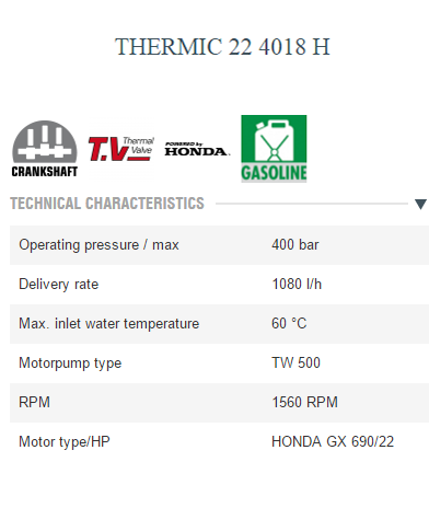 Comet TW Premium, TW 500 bar Premium pumps with brass pump head and ceramic pistons. Honda engine GX 690. Gearbox (with 1560 rpm pump ). Electrical starting. Ø 300 industrial wheels with brake. No engine-oil safety device (oil-alert). Hour counter. Automatic decelerator to reduce the number of revs in the bypass phase. Stainless steel gradual pressure restoration valve with EASY-START. Thermostatic valve. Water filte, readily serviceable cartridge type. Water suction from external tank option (self priming pumps). Hose reel can be mounted on request (cod. 0.966.0035)