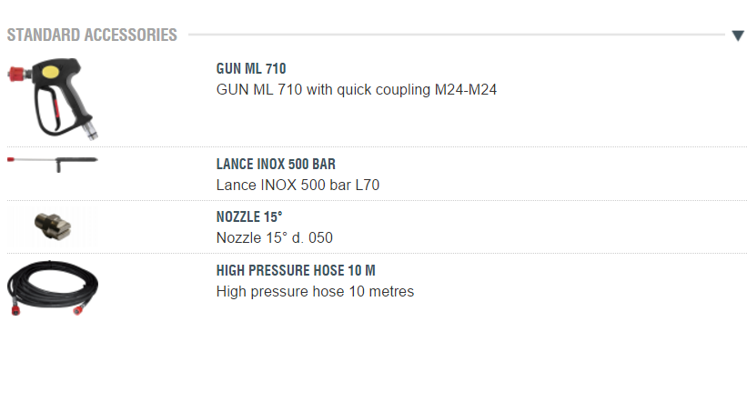 Comet TW Premium, TW 500 bar Premium pumps with brass pump head and ceramic pistons. Kohler engine 12KD477/2. Gearbox (with 1560 rpm pump). Electrical starting. No engine-oil safety device (oil-alert). Hour counter. Automatic decelerator to reduce the number of revs in the bypass phase. Stainless steel gradual pressure restoration valve with EASY-START. Thermostatic valve. Water filte, readily serviceable cartridge type. Water suction from external tank option (self priming pumps). Ø 300 industrial wheels. Hose reel can be mounted on request (cod. 0.966.0035).