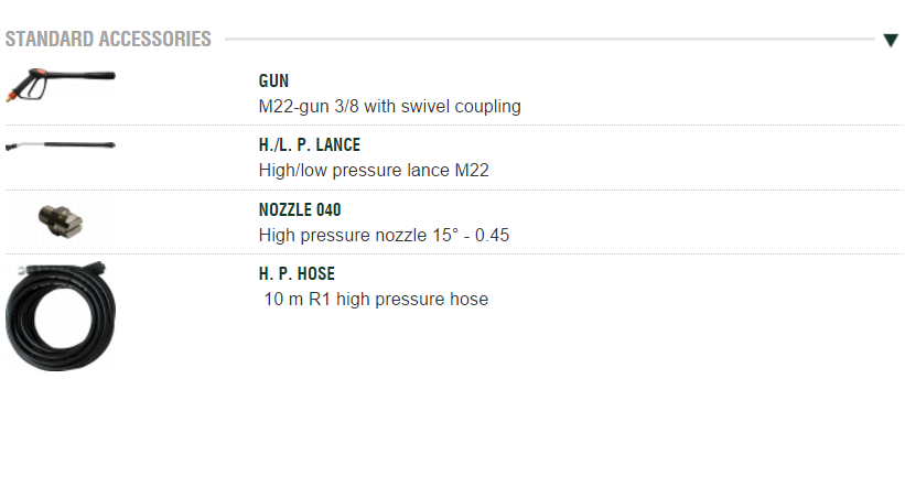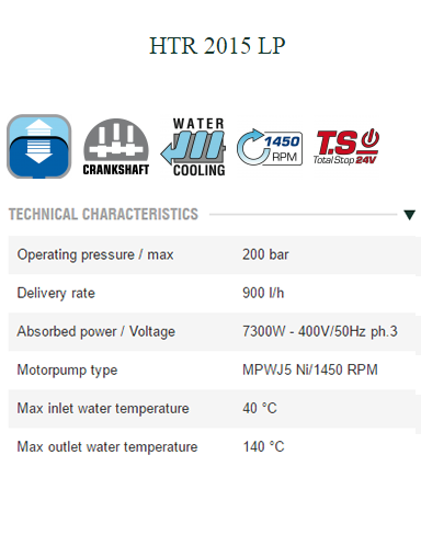 4 poles electrical motor (1450 RPM) with thermal protection and water cooling. Three ceramic pistons, brass linear pump head with built-in by-pass valve. Integrated elastic joint, for best pump coupling. Low voltage and delayed Total Stop. Vertical burner with high thermal efficiency steel coil. Auxiliary motor for air-cooling burner and two ways fuel pump. Regulation Temperature gauge with high sensitive stainless steelsensor. Header tank and antiscale device. Pressure accumulator for hose and gun vibrations prevention. Hose-reel (6.608.0010).