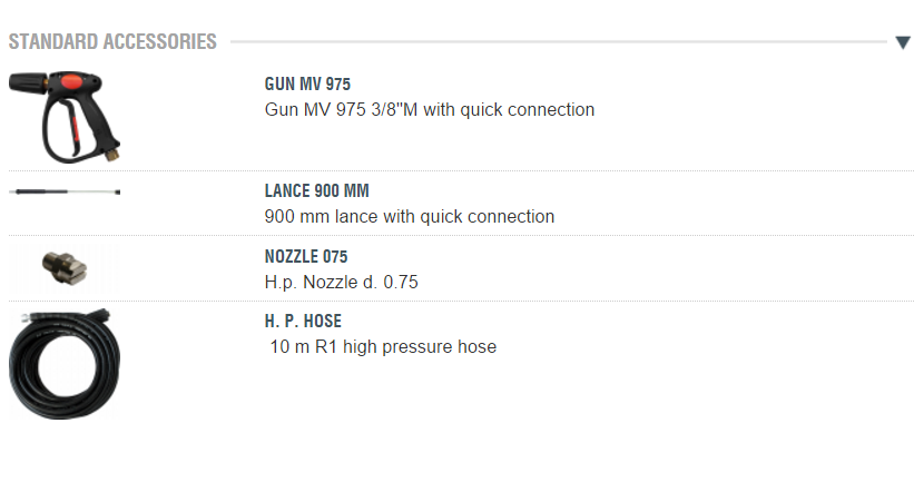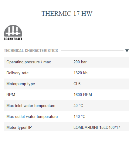Three ceramic pistons, brass linear pump head with built-in by-pass valve. By-pass thermal protection with safety valve. 2 cylinder water cooled diesel engine with electrical start. Integrated electric generator. Auxiliary belt driven alternator sturdy. Lombardini 15LD400 diesel engine (air cooled). Belt driven pump (1,450 RPM). Automatic engine RPM regulator. Tool Socket max 1.5 kW Integrated detergent suction with external suction probe. Front panel with engine function led and automatic power cut-off. Unique tank for diesel engine and burner. Battery included.