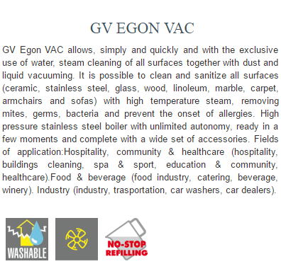 - Silent operation in sensitive and crowded areas, just setting the suction power on the gun. Thanks to the water filter it is possibile to empty dit water tank in a few seconds, no need of paper collector filtersNo more waiting for the boiler to cool down, it can be safely refilled,even while you are using it. Set the boiler, choose the steam intensity. All the controls are on the handle, press the lever to steam, press the button to vacuum.