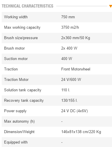 Capable to work for the maintenance and deep cleaning of large areas (up to 3.700 m²) with a very important reduction of cost of cleaning. More than 50 kg of constant pressure on the brushes. Large load tank capacity, resulting in reduced number of stops and maximum use of battery charge for effective operation of the machine. Compact size (810 mm). Stability even when fully loaded, front independent wheeldrive with tight steering radius. Recovery tank control window for cleaning and easy ordinary maintenance. Easy access to electrical components. Automatic device that stops brushes and detergent water outflow when the machine is stationary. Self-levelling brushes. The detergent water tank serves as battery compartment, allowing the housing of great capacity batteries granting continuous working time up to 4-5 hours.Large capacity shock and acid proof polyethylene tank (110 l )improves productivity avoiding frequent refilling and idle time. Simple and intuitive controls reduce operator’s training time.Easy mechanical brush plate and squeegee lifting system, for low maintenance costs. The enbloc brush plate apply a very high pressure (50 kg) to the floor, strongly and deeply removing any kind of dirt. The cleaning solution is purified by an easily accessible external filter which holds back any possible debris,thus protecting the solenoid valve operation. The ergonomic and comfortable shape of the machine allows the operator to work effortless for a long time, improving productivity.
