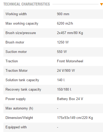Suitable for maintenance and deep cleaning of medium and large areas (up to 4.500 m²) with a considerable reduction of cleaning costs. More than 60/80 kg of constant pressure on the brushes. Large load tank capacity, resulting in reduced number of stops and maximum use of battery charge for effective operation of the machine. Compact size. Stability even when fully loaded • Front independent wheel-drive with tight steering radius. Easy access to electrical components. Automatic brush plate lifting system. Automatic squeegee lifting system. Automatic squeegee lifting while reverse going. Automatic device that stops brushes and detergent water outflow when the machine is stationary. Antifoam devic. Self-levelling brushes. High-performance batteries resulting in high-working efficiency.
