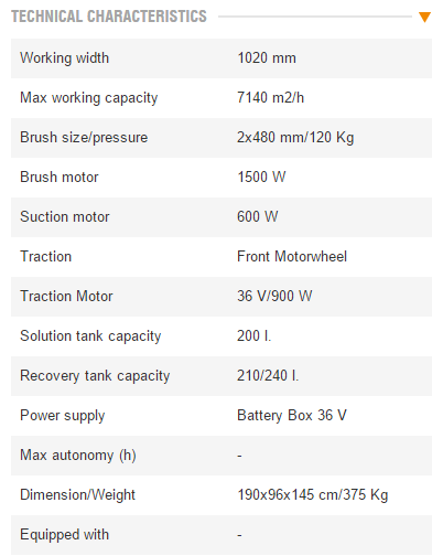 Suitable for maintenance and deep cleaning of medium and large areas (up to 6.000 m²). More than 90/120 kg of constant pressure on the brushes. Large load tank capacity, resulting in reduced number of stops and maximum use of battery charge for effective operation of the machine. Stability even when fully loaded. Front independent wheel-drive with tight steering radius. Easy access to electrical components. Automatic brush plate lifting system. Automatic squeegee lifting system. Automatic squeegee lifting while reverse going. Automatic control system for brush rotation and detergent water outflow. Antifoam device. Self-levelling brush plate. Hour meter. High-performance batteries resulting in high-working efficiency.Floor scrubber-driersStandard equipment The unique anti foam device dramatically reduces the foam generation and prevents it from touching the suction motor, thus protecting its operation.The electronic floating switch stops suction when the tank is full.Large tank opening for fast and easy cleaning and sanification. The strong V-shaped floor squeegee made of steel profile is widely adjustable and allows to combine the operation of the rubber blades with the high suction power, to get a perfect drying result on every surface. The special filter box retains solid debris and prevents the obstruction of the suction hose. The scrubbers are easy to use thanks to the simple and user friendly controls. From the control panel the operator can adjust the maximum forward speed and the quantity of cleaning solution outflow, selecting the options most suitable to the dirt type. Job is simplified and made faster by the automatic lifting of the squeegee and of the brush plate. Thanks to the optimal weight distribution and to the use of strong oil-proof polyurethane wheels the drive is perfect in all working conditions.The emptying of the solution water tank is quick with a simple and easy accessible mechanical tap.