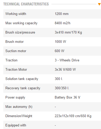 Suitable for maintenance and deep cleaning of medium and large areas (up to 7.000 m²). More than 120-170 kg of constant pressure on the brushes. 300 litres solution tank capacity allows exceptional autonomy and productivity. Stability even when fully loaded. Innovative traction system with three indipendent motor wheels controlled by electronic cards. Easy access to electrical components Automatic brush plate lifting system. Automatic squeegee lifting system. Automatic squeegee lifting while reverse going. Automatic control system for brush rotation and detergent water outflow. Antifoam device. Self-levelling brushes, hour meter, solenoid valve. High-performance batteries resulting in high-working efficiencyFloor scrubber-driers. Designed to perform the hardest work and to resist even to extreme stresses with maximum comfort; the frame is made of steel profiles with a thickness varying from 5 to 12 mm, protected with a high resistance corrosion-proof paint. The unique anti foam device dramatically reduces the foam generation and prevents it from touching the suction motor, thus protecting its operation.The electronic floating switch stops suction when the tank is full.Large tank opening for fast and easy cleaning and sanification. The cleaning solution tank with an exceptional capacity of 300 liters and the high autonomy of the battery ensure a productivity at the top of the range. The wide rear opening allows for an easy and quick refilling of the cleaning solution tank The motorwheels, designed and built by Lavor, grant optimal performances and exceptional reliability (over 30.000 hours). The innovative three-wheel drive system ensures perfect traction in every operating condition. The high power of the three motorwheels allows the machine to get over remarkable slopes.