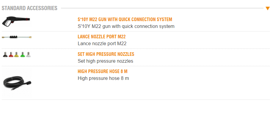 4 poles electrical motor (1450 RPM) with thermal protection. Three ceramic coated pistons, brass linear pump head with built-in by-pass valve. Suction and delivery S/S valves. Detergent built-in tank for indirect suction. Pressure regulator. Glicerine pressure gauge. Hose-reel (optional). Accessory holder. Hose-holder. Ergonomic handle.