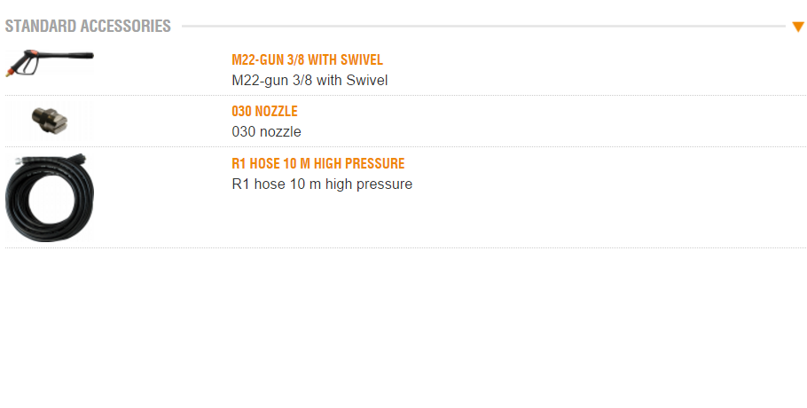 4 poles electrical motor (1450 RPM) with thermal protection. Three ceramic coated pistons, brass linear pump head with built-in by-pass valve. Suction and delivery S/S valves. Detergent built-in tank for indirect suction. Pressure regulator. Glicerine pressure gauge. Hose-reel (optional). Accessory holder. Hose-holder. Ergonomic handle.